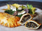 Įdaras – daržovės: morkos, brokoliai, žalieji žirneliai, saulėje džiovinti pomidorai.